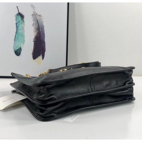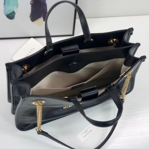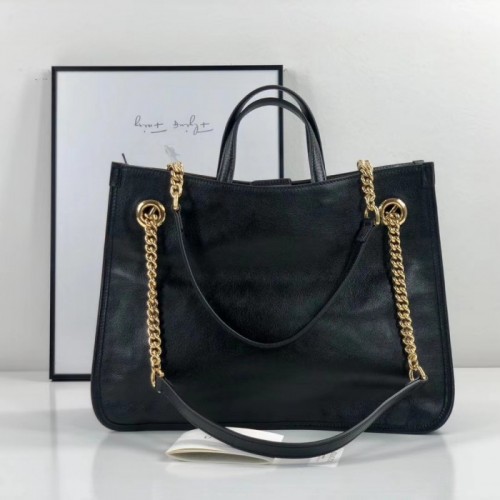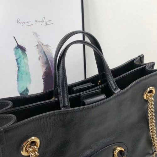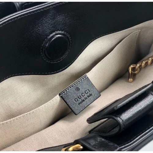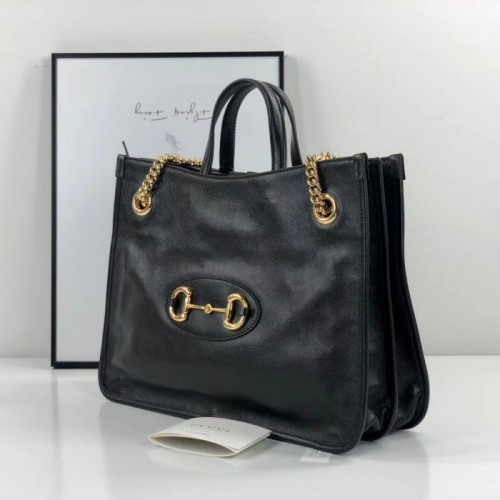 Spring and summer 2020 series adopts a slightly straight shape and round corner design to launch a new Gucci 1955 Horse Bit buckle tote bag. This medium Double Handle Tote bag is made of bright black leather, with chain straps and a clean and orderly interior structure for a modern look. This series continues the design details of the first bag used more than 60 years ago, while infusing the essence of modern fashion to show the unique charm of the horse buckle. As one of Gucci's classic heritage, this design pattern, which is composed of two elements of double ring and long strip, is inspired by the origin of the brand's equestrian, and has become one of the brand's most dazzling iconic elements up to now.