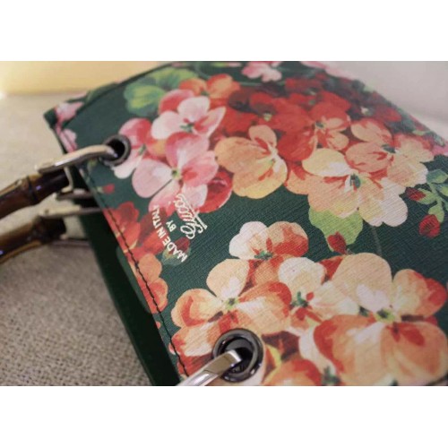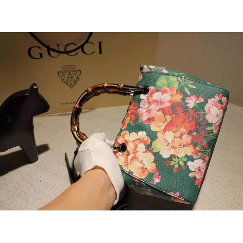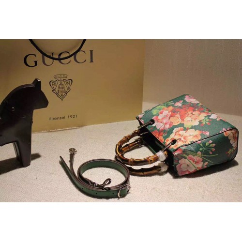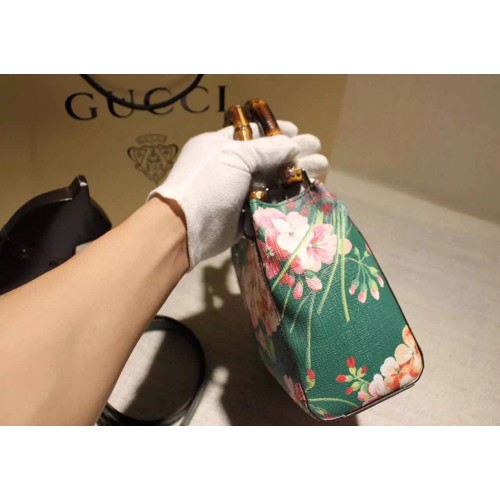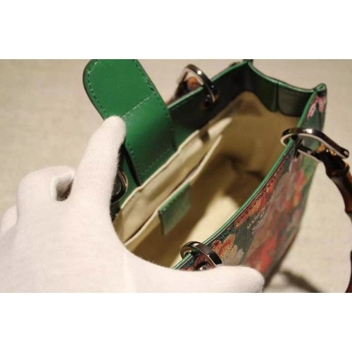 Gucci 368823 Bamboo Shopper Mini Green Blooms Top Handle Bag F/W2015SKU:c16-09Size:21*17*8cmColors:Pink,Green,CeriseBlush pink blooms print leatherSilver hardwarenatural cotton linen liningembossed gucci trademarkMade in ItalyDouble bamboo handles with 3" dropDetachable and adjustable shoulder strap with 23" dropTop snap closureInterior open pockets
