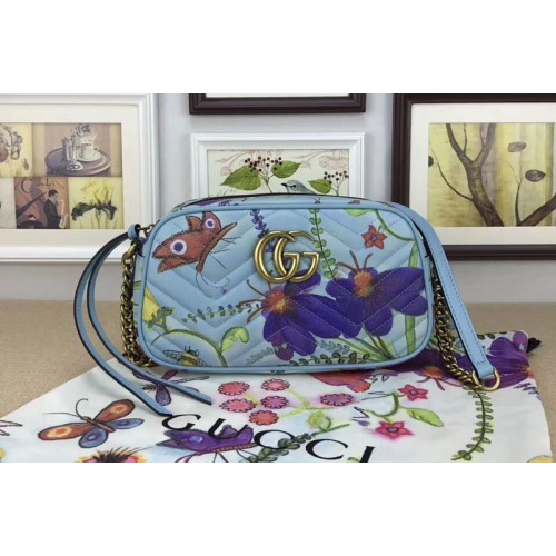 ; Light blue “Jeanie’s Garden” print matelassé chevron leather with GG on the back