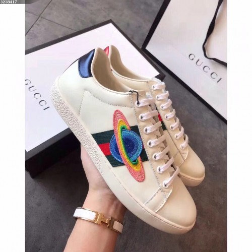 Gucci Ace Leather Low-Top Lovers Sneakers Comet Embroidered Creamy 2018