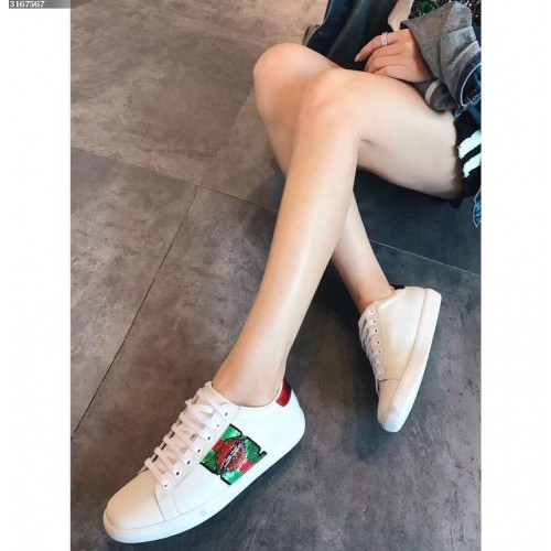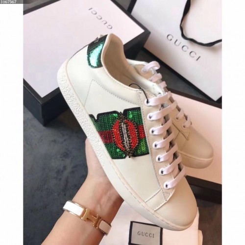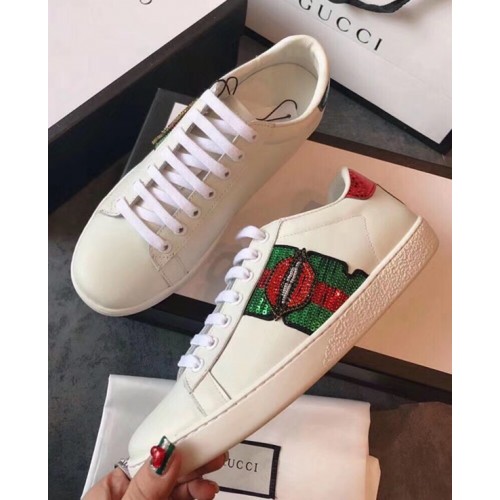 Gucci Ace Leather Low-Top Lovers Sneakers Mouth Beading Creamy 2018