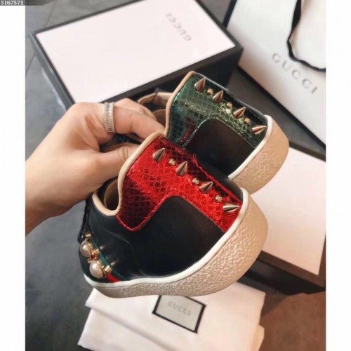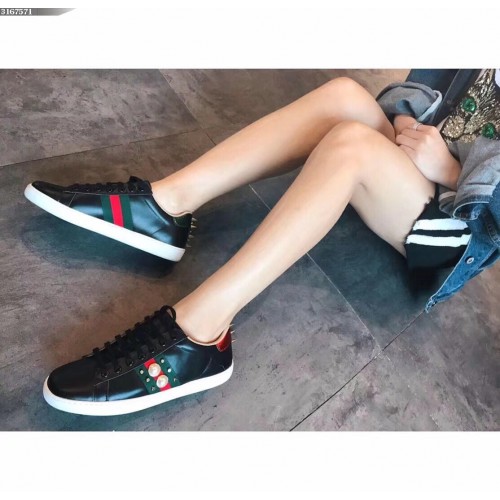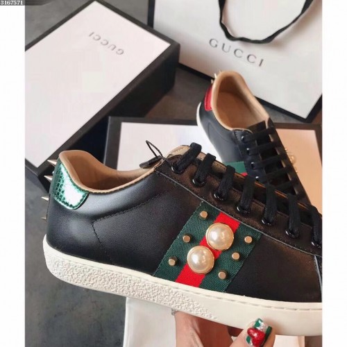 Gucci Ace Leather Low-Top Lovers Sneakers Web Pearl Studs Black 2018