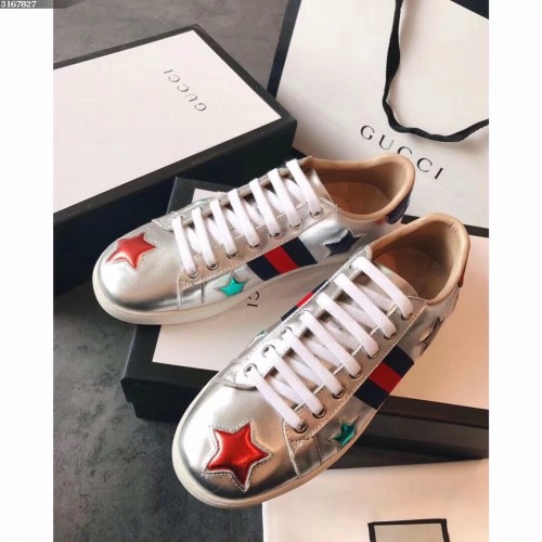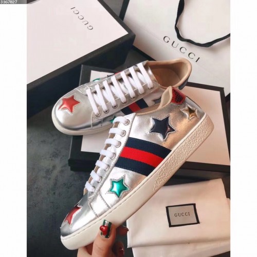 Gucci Ace Leather Low-Top Lovers Sneakers Web Star Silver 2018