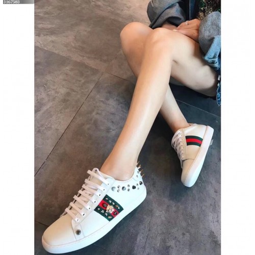 Gucci Ace Leather Low-Top Lovers Sneakers Web Studs And Metal Feline White 2018