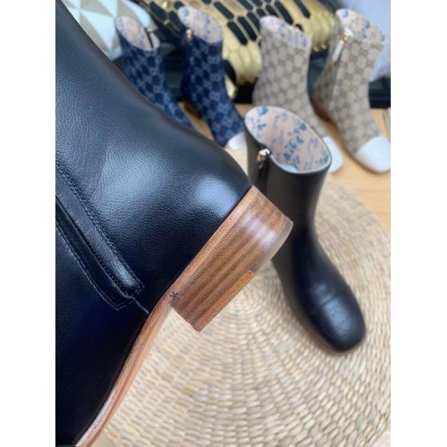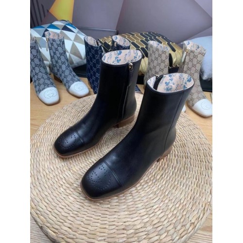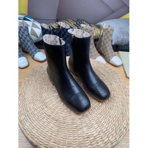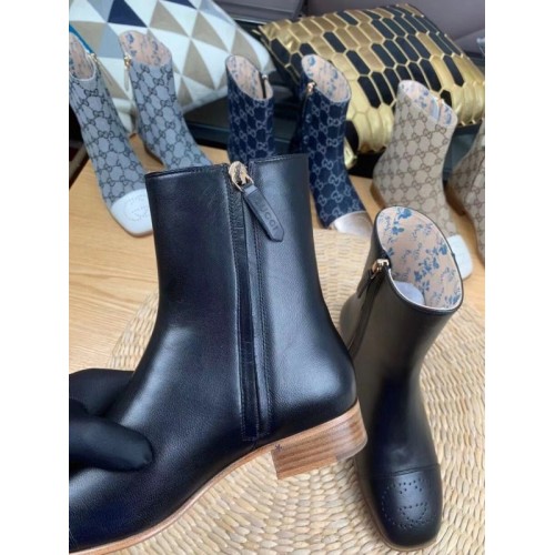 This pair of leather ankle boots is characterized by the Interlocking G motif—a nearly 100 year old symbol that has been brought back into the forefront of Gucci's designs in unexpected ways. Here, the monogram appears as a contemporary perforated detail.
