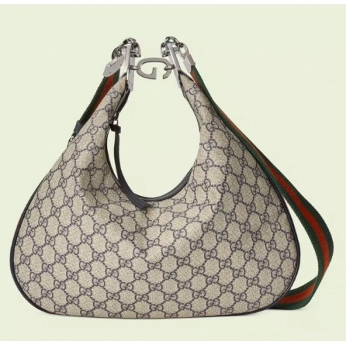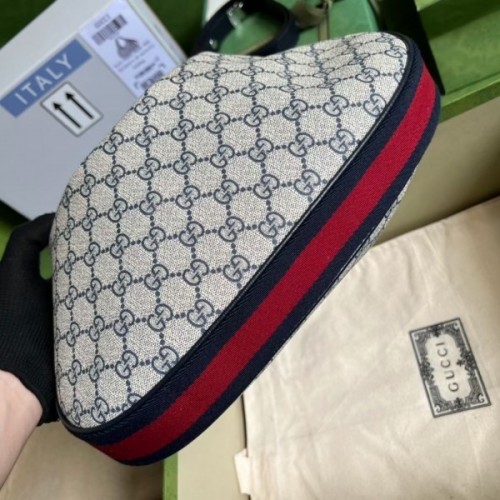 An ode to the timeless Hollywood glamour that shaped Gucci Love Parade, classic elements from the House's archives are reintroduced. Distinguished by its crescent moon shape, the accessory is further defined by a G shaped hook closure. Paired with soft materials, the heritage hardware creates a refined design with vintage appeal. This large version is crafted from beige and blue GG Supreme canvas, complete with a blue and red Web trim.