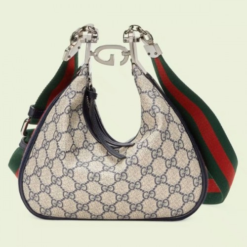 An ode to the timeless Hollywood glamour that shaped Gucci Love Parade, classic elements from the House's archives are reintroduced. Distinguished by its crescent moon shape, this small shoulder bag further defined by a G shaped hook closure. Paired with soft materials, the heritage hardware creates a refined design with vintage appeal. GG Supreme canvas in beige and blue accentuate the logo feel.
