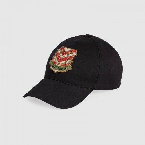 A baseball hat crafted from black gabardine and lined with cotton. On the front, the accessory is adorned by a patch featuring the "Gucci Band" motto and the lyre—two symbols which recur throughout the Gucci Pre-Fall 2019 collectsion.
