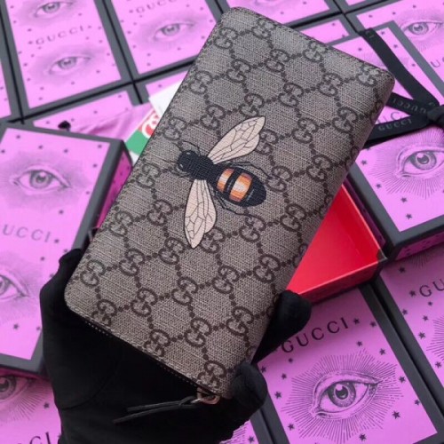 The bee-a symbol first seen in Gucci ready-to-wear in the 1970s-was taken from the archives and reintroduced in the Fall Winter 2015 collectsion. Here, it is printed at the center of a zip around wallet made in GG Supreme canvas, a material with low environmental impact.