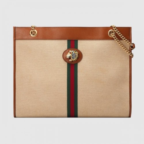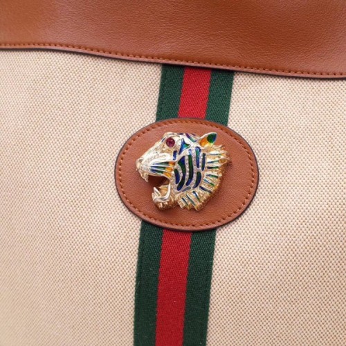 The Rajah tote is reintroduced for Pre-Fall 2019 in vintage canvas—a bi-color woven fabric with a slight aged effect that enhances a vintage appeal. The line is defined by the tiger head finished with colored enamel and sparkling crystals, inspired by a vintage piece from legendary fashion and jewelry designer Hattie Carnegie's 1940s archives. The bag is trimmed with brown leather and the green and red Web.