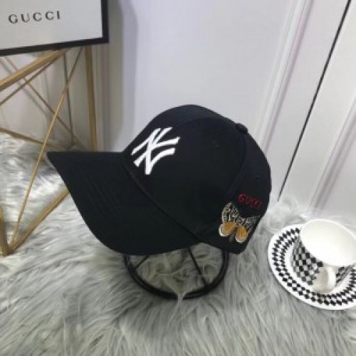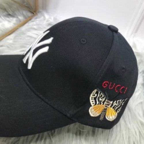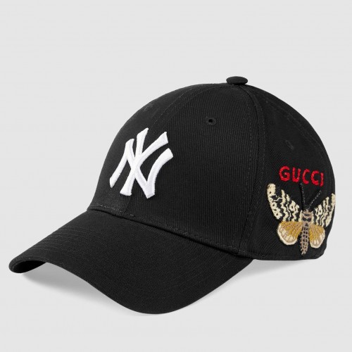 Inspired by the customized Major League Baseball hats that have come to define Alessandro Michele's looks, a special line-up of caps presented for the Pre-Fall 2018 collectsion combines the New York Yankees™ patch with emblematic House codes. A recurrent motif, an embroidered butterfly appliqué adorns the side of the accessory with "Gucci" embroidery.