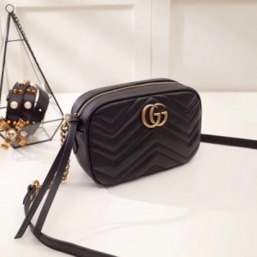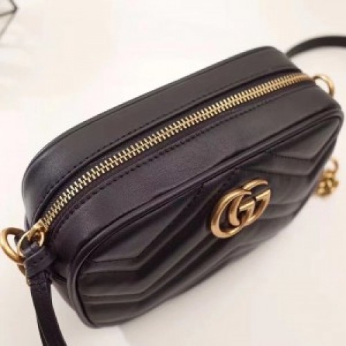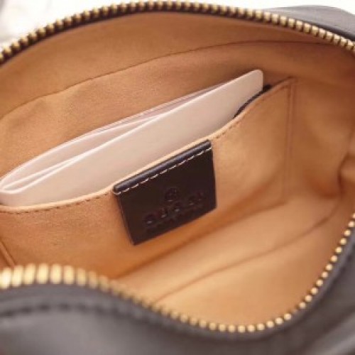The mini GG Marmont chain shoulder bag has a softly structured shape and a zip top closure with Double G hardware. The chain strap has a leather shoulder detail. Made in matelassé leather with a chevron design and GG on the back.