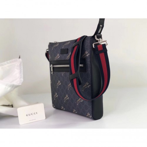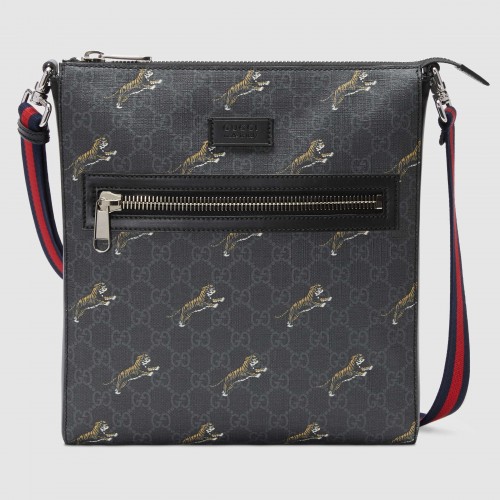 The messenger bag is reimagined for Pre-Fall 2019 with the season's newest iteration of the GG pattern, printed with leaping tigers scattered across the black and grey GG Supreme base. Finished with a front zipper pocket and a blue and red Web strap that can be adjusted to be worn on the shoulder or cross body.