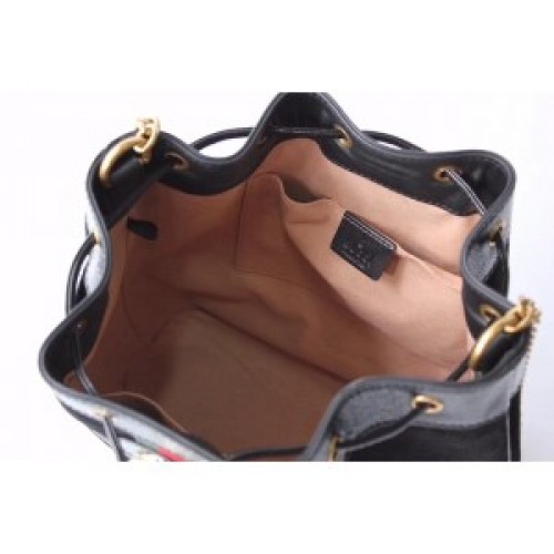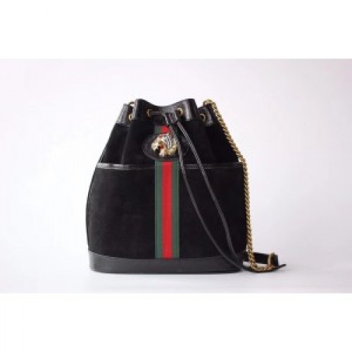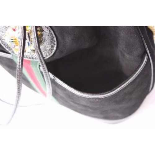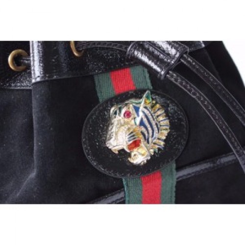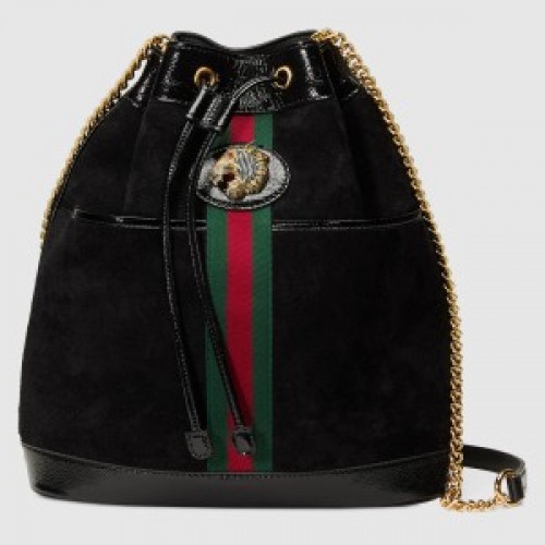 The bucket bag shape in black suede is trimmed in shiny patent leather and enriched with the green and red Web. The tiger head defines this collectsion of bags, finished with colored enamel and sparkling crystals inspired by a vintage piece from legendary fashion and jewelry designer Hattie Carnegie's 1940s archives.
