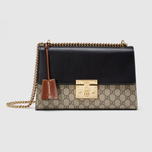 This medium-sized Padlock GG Supreme is structured to perfection, with a leather top and key lock closure which secures all of your stuff in style. Its sliding chain strap can be worn into multiple styles, which renders it as a very versatile piece! Top handle or shoulder bag, it’s there to bring you a billion style points.