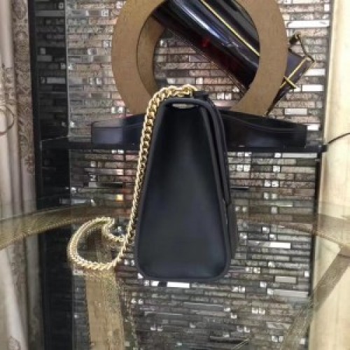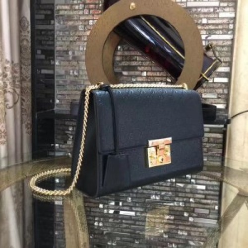 A structured Gucci Signature leather bag with a key lock closure pulled from the archives, the key is placed in a leather key case that loops around the chain. The sliding chain strap can be worn multiple ways, changing between a shoulder and a top handle bag. Made in heat debossed Gucci Signature leather resulting in a defined print with a firm texture.