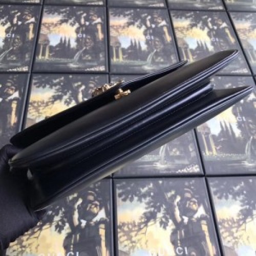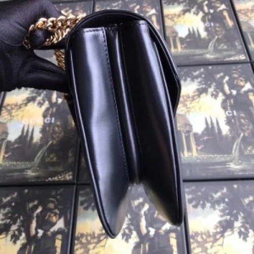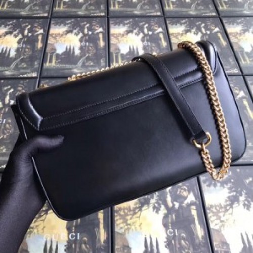 Gucci's Rajah Medium shoulder bag features a new hybrid symbol, the label's iconic horsebit and GG logo have merged to create one statement motif. The boxy design has been crafted from smooth leather in a shape that resembles a chic envelope. The tiger head embellishment is adorned with sparkling crystals and is inspired by a vintage brooch by legendary jewelry designer Hattie Carnegie.