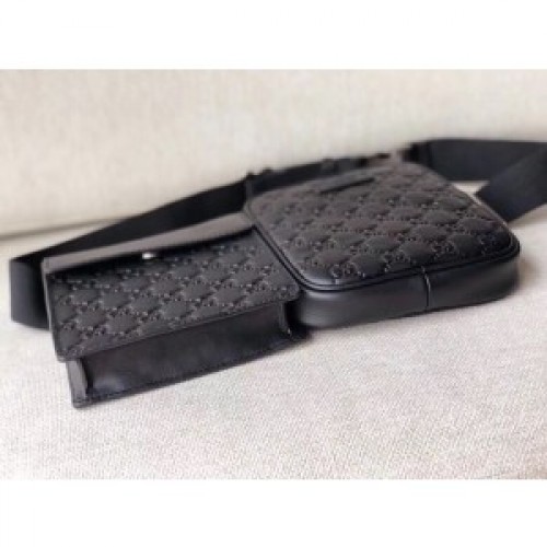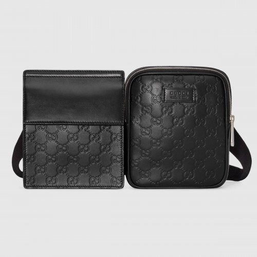 The double pouch belt bag is made in Gucci Signature leather. The GG motif is heat debossed to create a defined print with a firm texture.