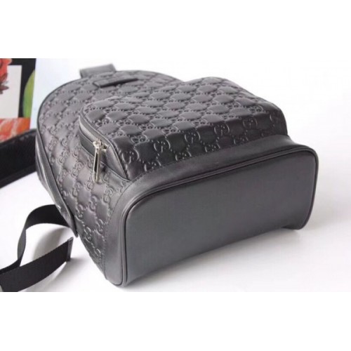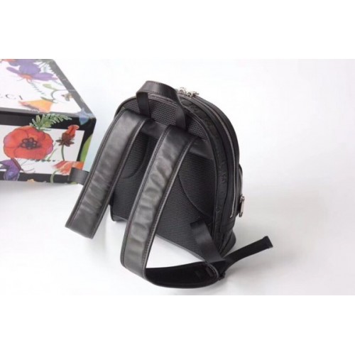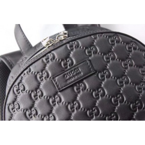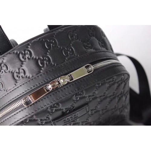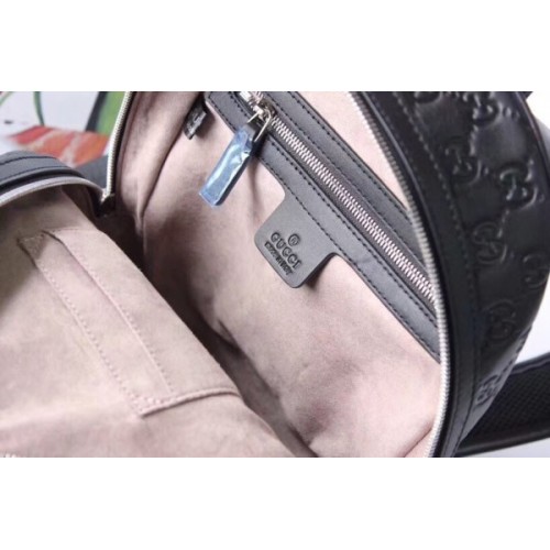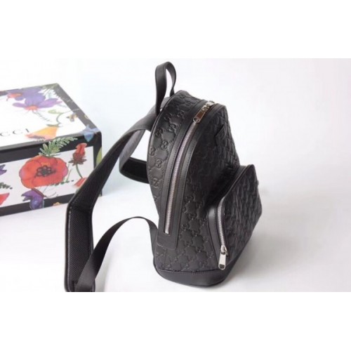 A classic backpack shape with a front zip pocket and multiple interior pockets. Made in heat debossed Gucci Signature leather with a defined print and firm texture.
