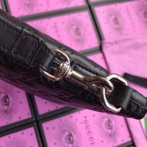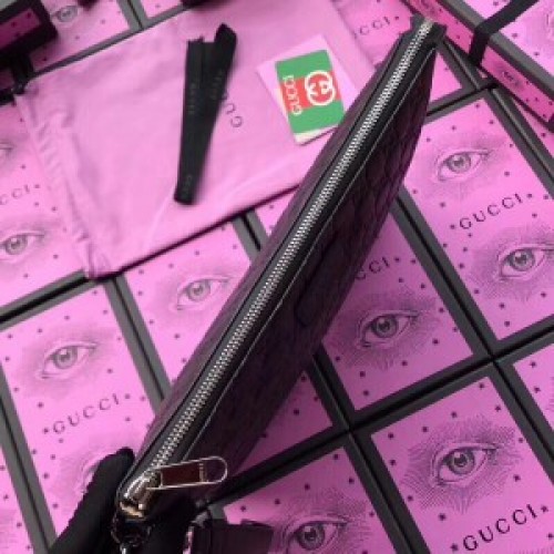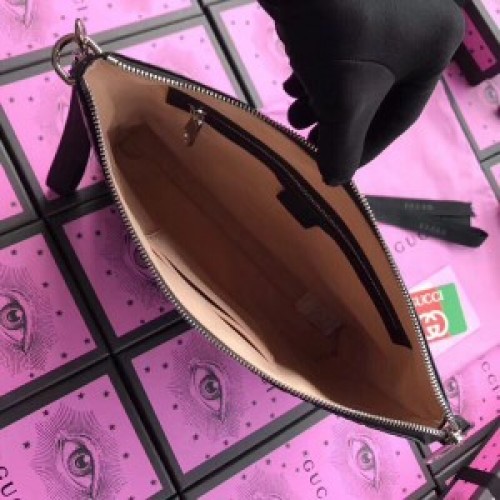 A slim leather pouch with removable handle made in Gucci Signature soft-an update to Gucci's classic heat debossed leather with a softer, more malleable construction.