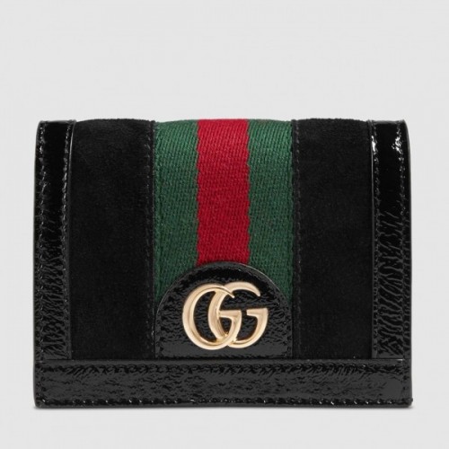 Imbued with retro-inspired references, the world of Ophidia evolves with the introduction of new small accessories. Defined by the mix of softened black suede, crackled patent leather and the classic green and red Web stripe, the card case wallet has a retooled vintage appeal and features a precious, tiny version of the archival Double G.