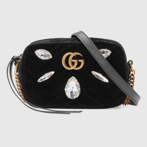 Gucci Crystals GG Marmont Velvet Small Chain Shoulder Bag 443497 Black 2017