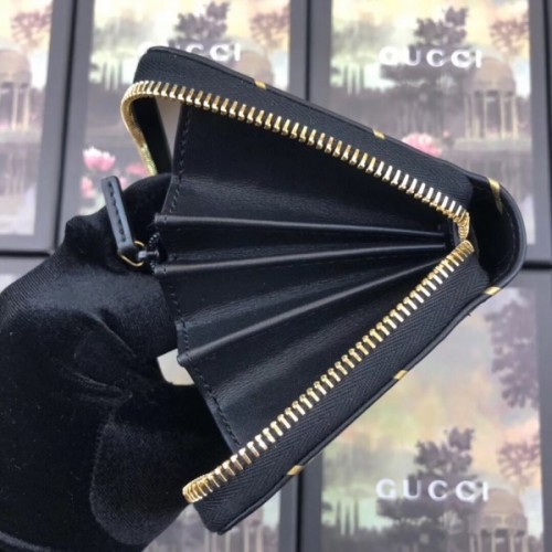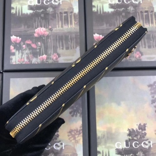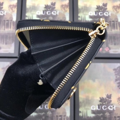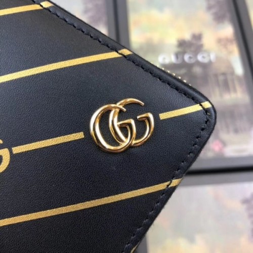 The zip around wallet in black leather is embellished with a Double G stripe print that shines in metallic gold. A small metal Double G at the corner is placed to appear as part of the print. The historic House code pulled from the archives is reintroduced and reinterpreted season after season.