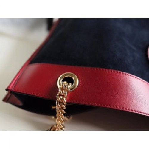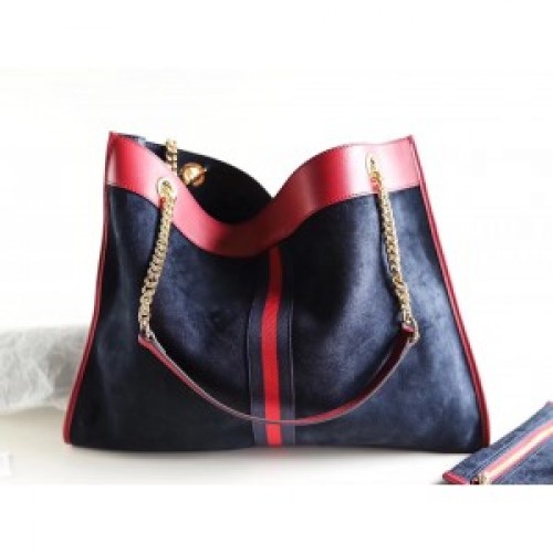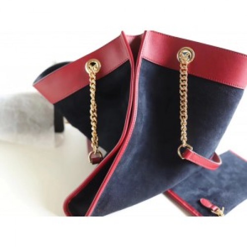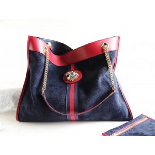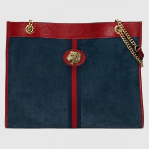 A recurring motif of this season, the tiger head finished with colored enamel and sparkling crystals is inspired by a vintage piece from legendary fashion and jewelry designer Hattie Carnegie's 1940s archives. For Fall Winter 2018, the detail has come to define a new line of retro-inspired handbags, including this dark blue suede tote, trimmed in red leather and enhanced by the blue and red Web inlaid onto the front.
