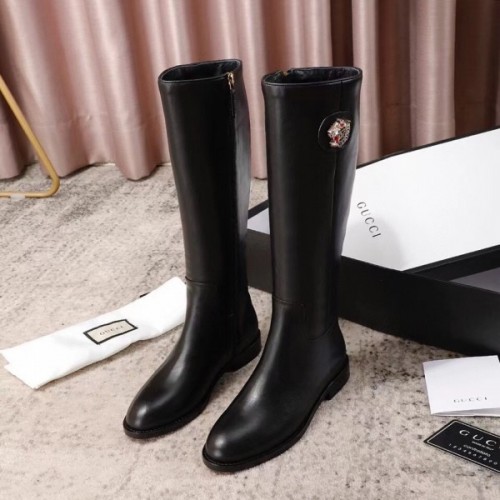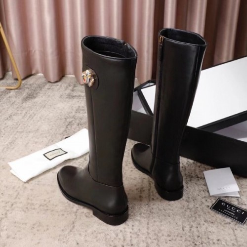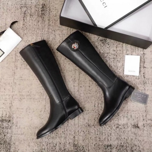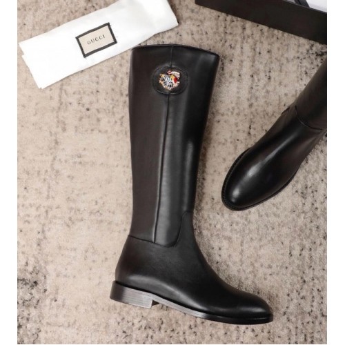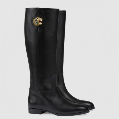 The black leather flat boot has a sleek design that goes to the knee. The side is embellished with a gold metal tiger head encrusted with sparkling crystals and colored enamel. A detail borrowed from the Rajah handbag line, it is reminiscent of a vintage brooch by Hattie Carnegie—a legendary jewelry and fashion designer in the 1920s-1950s.