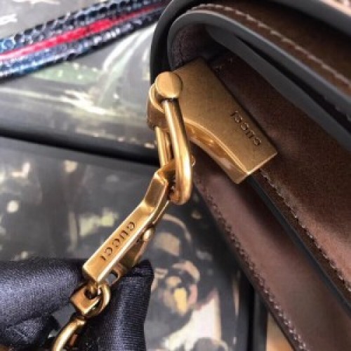 Mystical references from the Spring Summer 2018 runway are incorporated in a number of ways. The snake—an iconic symbol of the House—is depicted in metal, surrounding rows of glittering crystals and colorful stones that create a kaleidoscope effect. The detachable shoulder strap is made up of strips of snakeskin in blue and red—designed to reflect the colors of the Web stripe—connected by gold-toned metal hinges that further enrich the design.