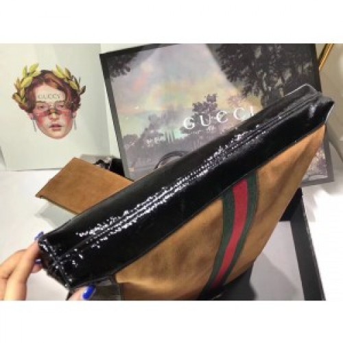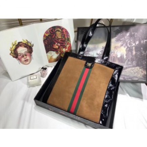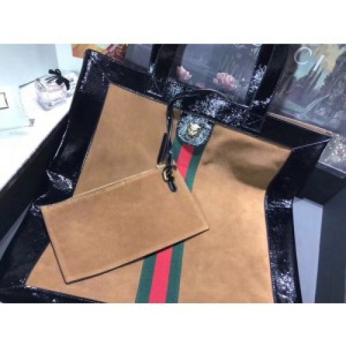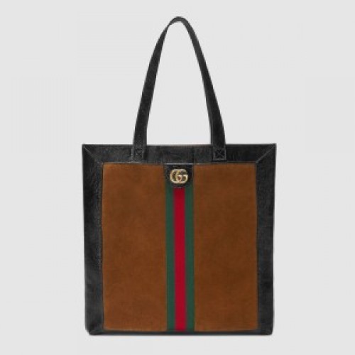 First developed by Gucci in the 1950s, the Web stripe continues to pay homage to the House's roots and equestrian influences, inspired by the strap that secured the saddle to the horse. Portrayed in its most notable combination of green and red, the stripe runs down the center of a large, unlined tote. The softened suede, crackled leather and archival House codes lend to the retooled vintage appeal that ties into the nostalgic undertones of the Spring Summer 2018 collectsion.