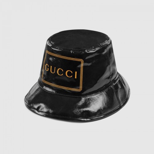 Crafted from a soft and lightweight black cotton fabric, this bucket hat is printed with the Gucci logo and specially coated for a shiny finish.