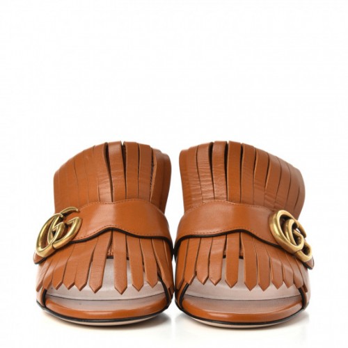 We guarantee this is an authentic GUCCI Calfskin GG Marmont Fringe Mid Heel Slide Sandals 38.5 Cognac or 100% of your money back. These bold heels are crafted of shiny calfskin leather in brown. They feature a fringe detail at the tongue with an antique gold GG logo, a rounded toe, and a 3-inch block heel.