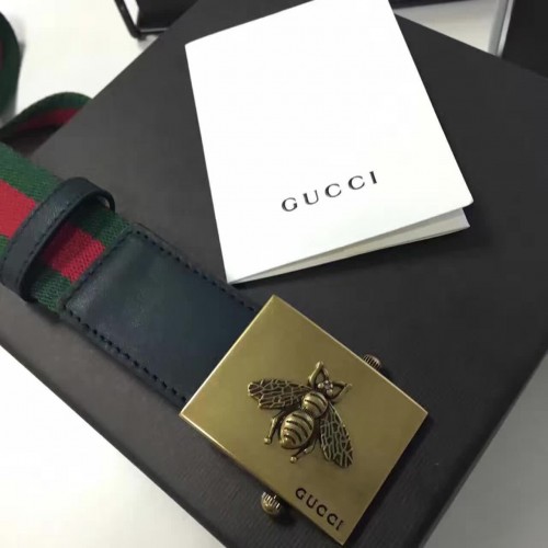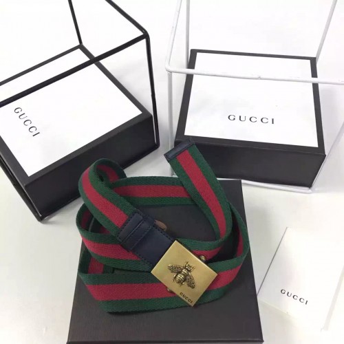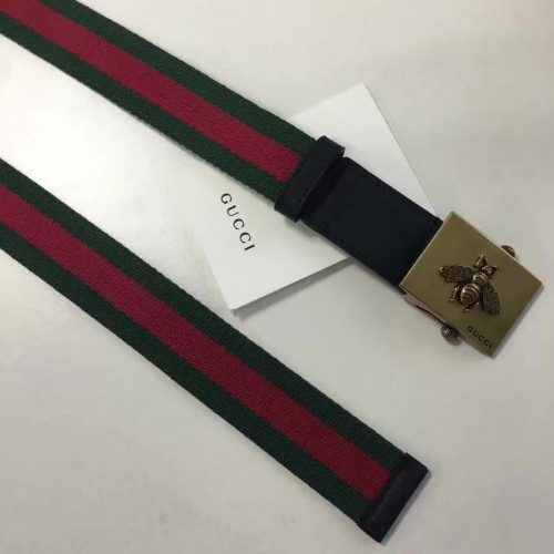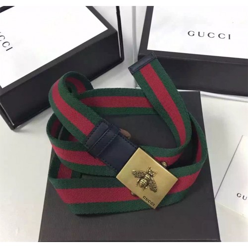 Signature Web canvas belt with a unfinished faded leather trim and our plaque buckle with embossed bee detail.Green/red/green cotton canvas Web with brown faded leather detailPlaque buckle with embossed bee detail1.5" widthAntique brass hardwareMade in Italy