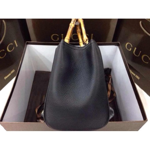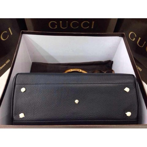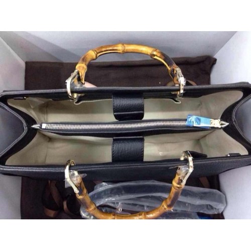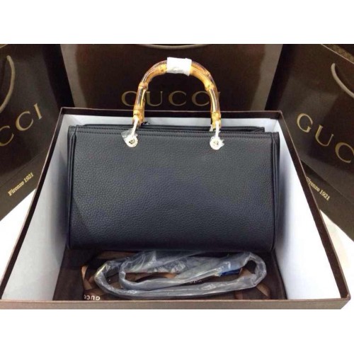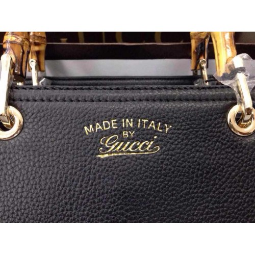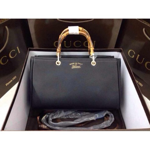 black leather light fine gold hardware black cotton linen lining embossed gold gucci trademark Made in Italy double bamboo handles with 4.5" drop detachable and adjustable leather shoulder strap with 19.5" drop double hidden magnet closure interior zip and smart phone pockets interior zip compartment and snap pocket protective metal feet large size: 16"W x 11.5"H x 7"D