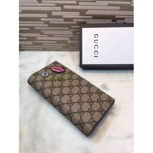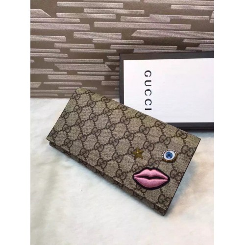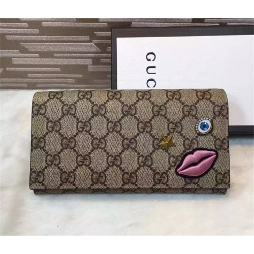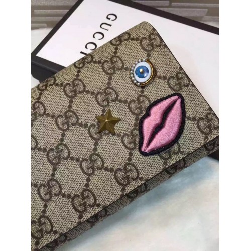 size:19*10*2.5 cmthis continental wallet made in our gg supreme canvas has a star, eye and mouth appliqué on the front which forms a face.Beige/ebony GG Supreme canvas, a material with low environmental impact, with pink leather detail and star, eye, and mouth appliquésMade in ItalySnap closureSix card slots and two bill compartmentsTwo separate interior compartmentsZip coin pocketClosed: W19cm x H10cm x D2.5cmOpen: W19cm x H18cm