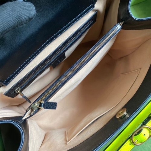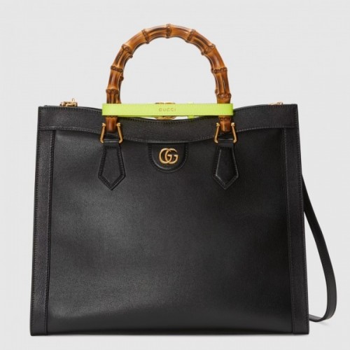 Combining recognizable elements of the House, the medium-sized tote bag is defined by its bamboo handles and Double G hardware. Crafted from smooth leather, the accessory is further accentuated by two neon bands, a playful reference to the bands used to keep handles in shape.