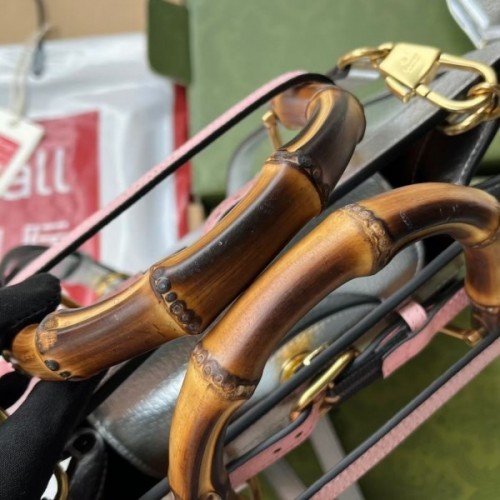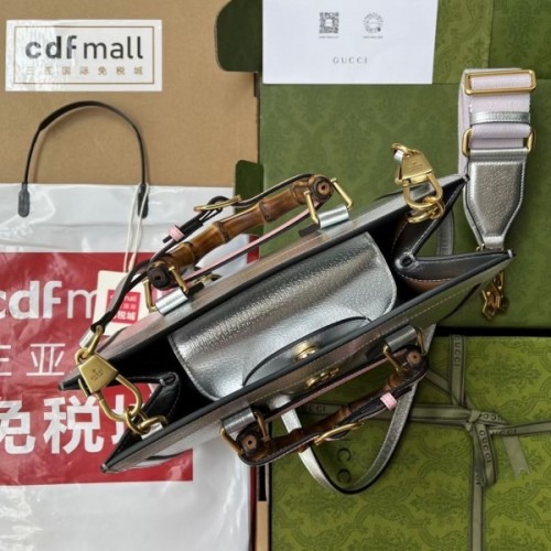 Silver leather with a striking metallic finish enriches this bag with a versatile nature that moves seamlessly from day to night. The silver-toned material is combined with the line's emblematic bamboo hardware, elevating the archival detail with a defined contemporary feel.
