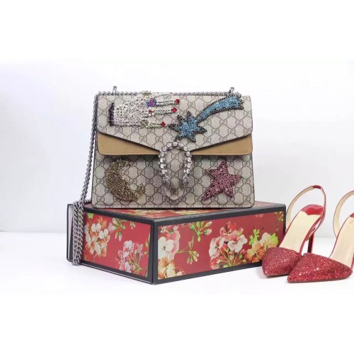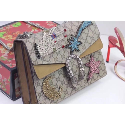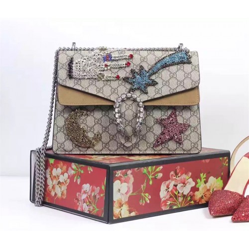 A structured suede bag with our textured tiger head closure-a unique detail referencing the Greek god Dionysus, who in myth is said to have crossed the river Tigris on a tiger sent to him by Zeus. The sliding chain strap can be worn multiple ways, changing between a shoulder and a top handle bag. The embroidered rhinestone, small stone and bead appliqués are specially manufactured by expert craftsmen in India, each appliqué is sewn by hand onto organza. The appliqués are then hand sewn onto the bags by expert craftsmen in Italy. Every product is unique and may differ between one piece to another because of the quality characteristics of a handcrafted article.GG Supreme canvas, a material with low environmental impact, with taupe suede detaiAntique silver toned hardwareRhinestone hand appliqué with colored stones and beads, rhinestone comet appliqué, rhinestone moon appliqué, and rhinestone star appliquéTiger head closureHand-painted edgesHand-stitched detailsInterior zippered compartmentPocket under the flapExternal rear pocketSliding chain strap can be worn as a shoulder strap with 15" drop or can be worn as a top handle with 8.5" dropPin closure with side release30*21*9 cm