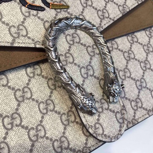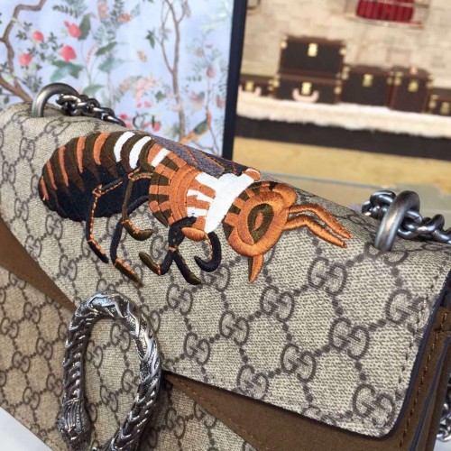 An embroidered GG Supreme canvas bag with our textured tiger head closure-a unique detail referencing the Greek god Dionysus, who in myth is said to have crossed the river Tigris on a tiger sent to him by Zeus. The sliding chain strap can be worn multiple ways, changing between a shoulder and a top handle bag. Using brass thread wrapped in silk, the bee is hand-embroidered on to silk then applied to the front.Beige/ebony GG Supreme canvas, a material with low environmental impact, with bee embroidery and taupe suede detailTiger head closureHand-painted edgesHand-stitched detailsInterior zippered compartmentPocket under the flapSliding chain strap can be worn as a shoulder strap with 15" drop or can be worn as a top handle with 8.5" dropPin closure with side releaseMedium12"W x 8"H x 4"DSuede lining with GG Supreme canvas inside the pockets