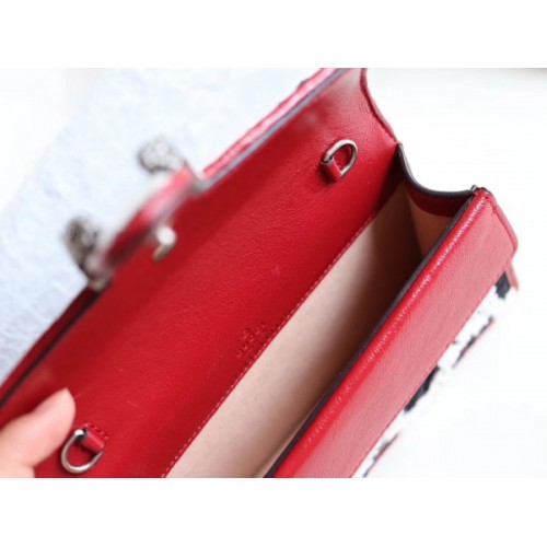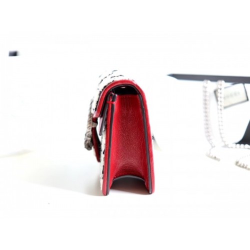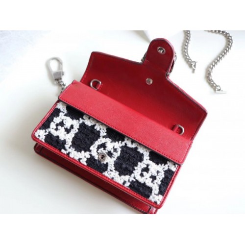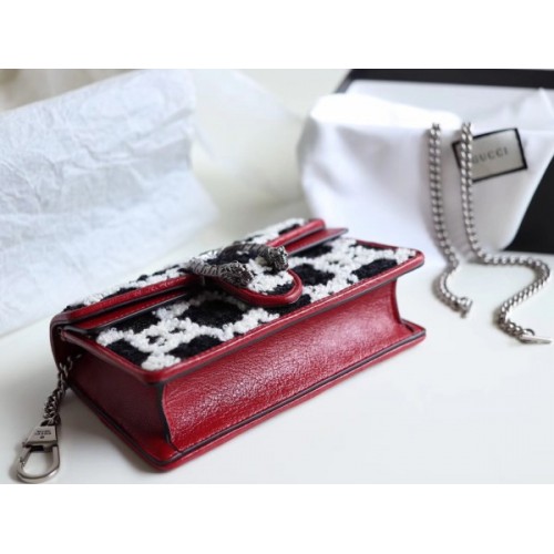 A structured super mini bag trimmed with bright, cerise colored leather. First used in the 1970s, the GG logo was an evolution of the original Gucci rhombi design from the 1930s. Combining House codes in unexpected ways, here the monogram motif is presented on a textured tweed fabric created from three-dimensional yarn in contrasting black and white tones. The petite shape is completed by the tiger head closure, a detail now synonymous with the Dionysus line.