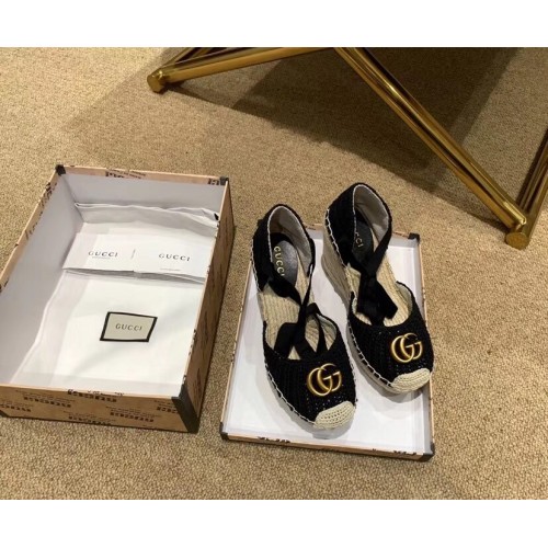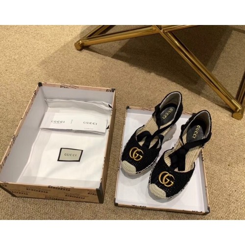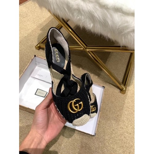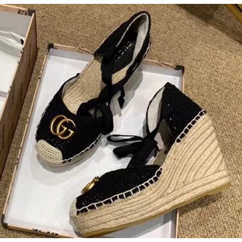 Gucci Double G Crochet Platform 10cm Espadrille with Grosgrain Lace-up Black