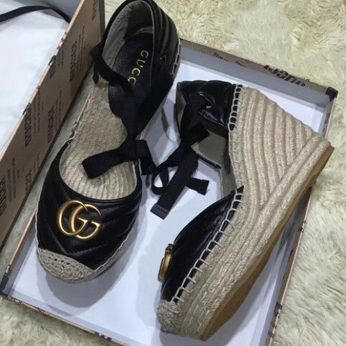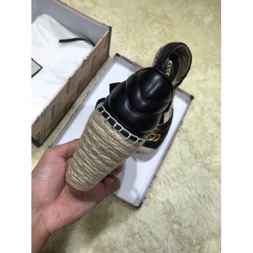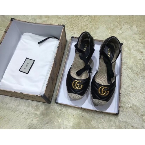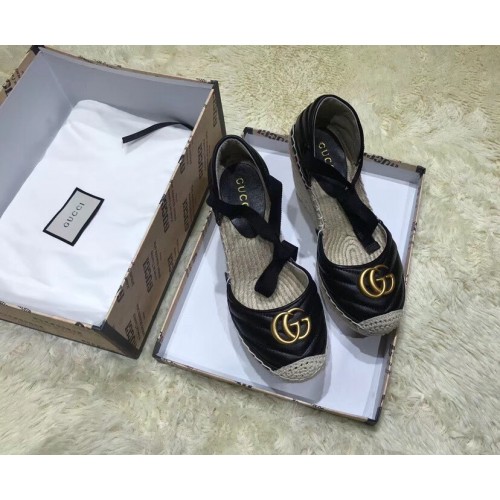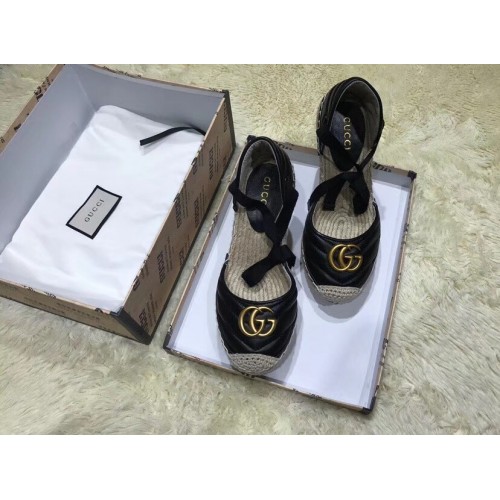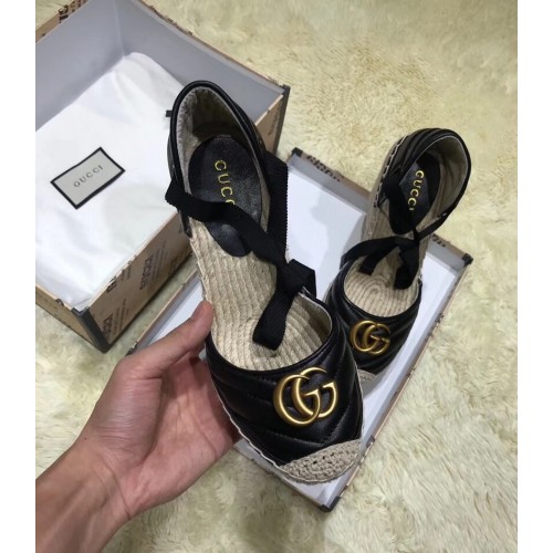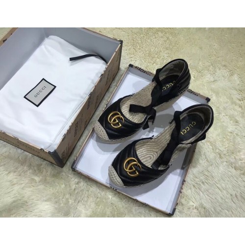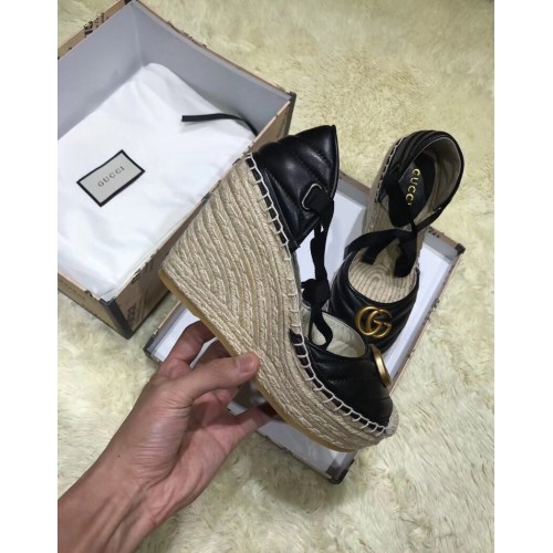 Gucci Double G Leather Platform 10cm Espadrille 573023 with Grosgrain Lace-up Black