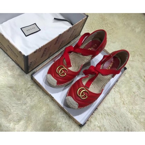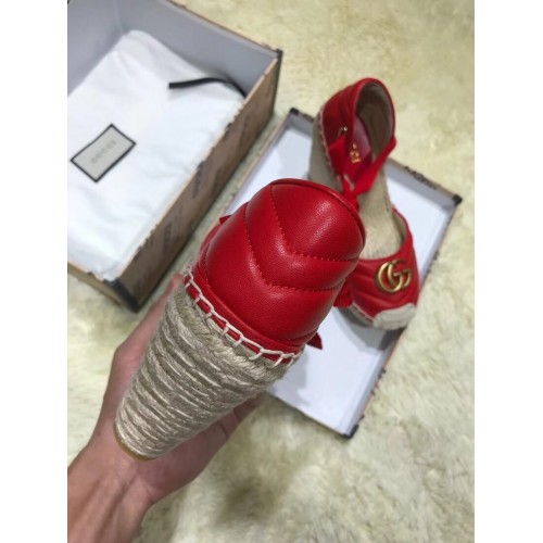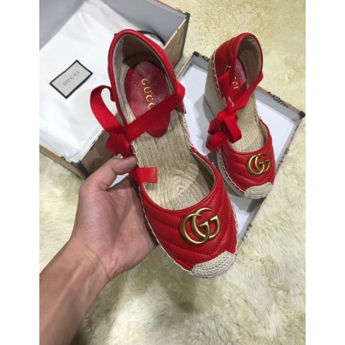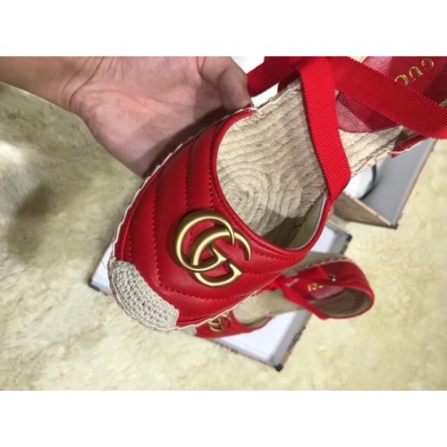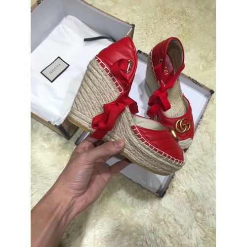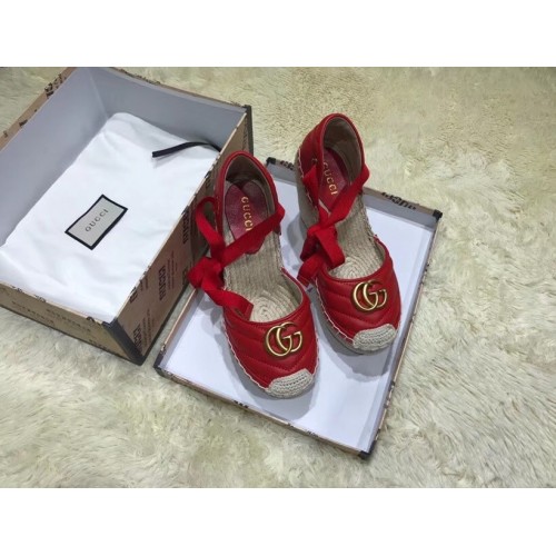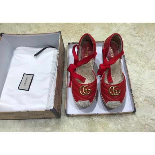 Gucci Double G Leather Platform 10cm Espadrille 573023 with Grosgrain Lace-up Red
