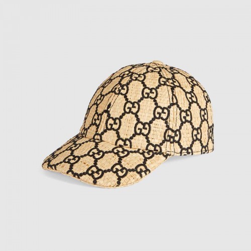 An unexpected combination of refined materials and streetwear inspired styles, this baseball hat is crafted from raffia with the House's monogram motif. As accessories continue to come to the forefront of Gucci's collectsion, the snakeskin detail at the back adds a precious note. New shapes and signature Gucci lines are reimagined in a mix of fabrics and trims imbued with an inherently summer feel.