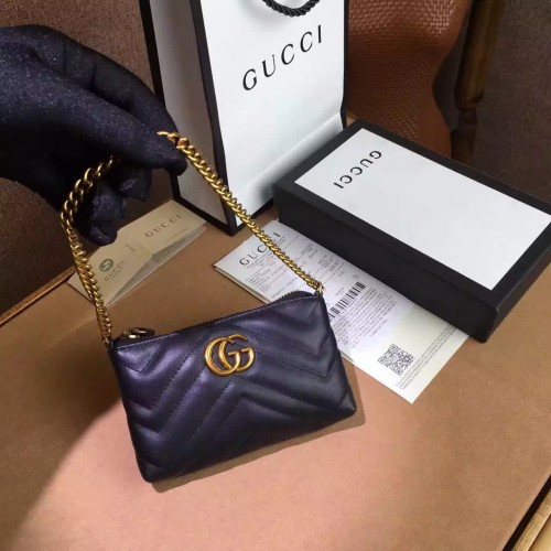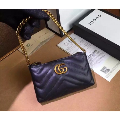 A GG Marmont chain mini bag that can also be worn as a wristlet. Made in matelassé leather with a chevron design and GG on the back.Matelassé chevron leather with GG on the backDouble GChain strap adjustable to be worn as a wristletZip top closure16*8*2 cmAntique gold toned hardwareMade in Italy
