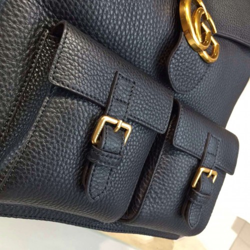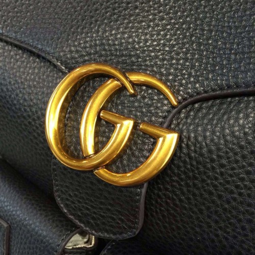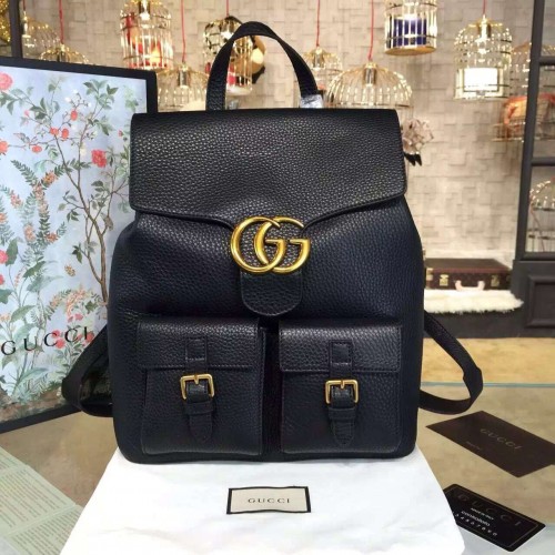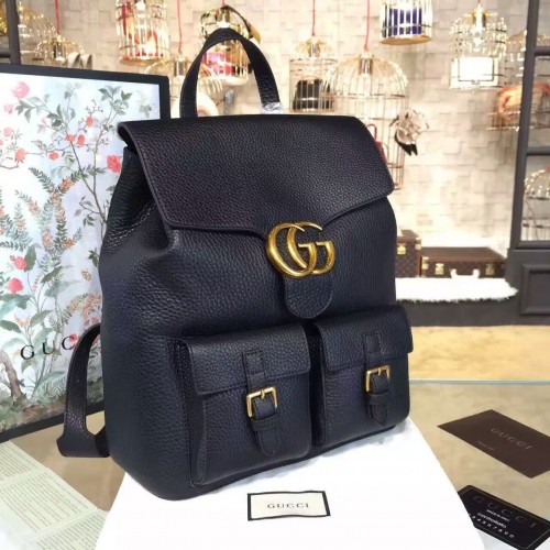 The GG Marmont backpack is distinguished by our signature double G closure. Secured with a drawstring closure and flap. Made in our signature textured leather, noted for its softness.Black leatherAntique brass hardwarePush snap flap with Double G hardwareFront flap pocketsInterior zipper and smartphone pocketsAdjustable leather strapsNylon drawstring closure29*13*34 cmGrey cotton linen liningMade in Italy
