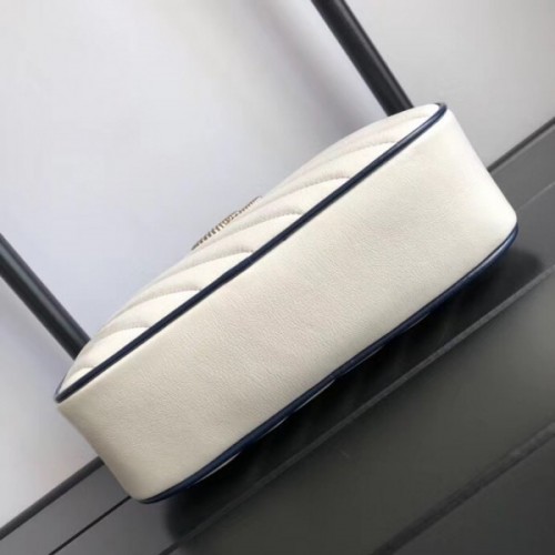 The zip-top small GG Marmont bag is introduced in white diagonal matelassé quilted leather for Pre-Fall 2020, completed with a twisted torchon Double G embellishment. The chain shoulder bag is outlined in contrast dark blue piping and has a leather shoulder detail for added comfort.