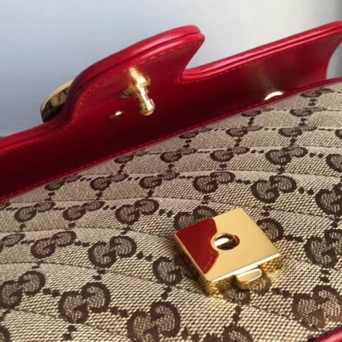A statement Gucci accessory, reimagined with a strong logo connotation for Spring Summer 2020. Defined by the archival Double G hardware from the '70s, the GG Marmont bag is presented in diagonal matelassé Original GG canvas—a timeless pairing that pays homage to the House's heritage. The small chain shoulder bag's distinct softly structured shape is outlined in contrast red leather trims, highlighting its flap closure. The sliding chain strap smoothly transforms from a single shoulder length to a doubled top handle length for multiple ways to wear the bag.