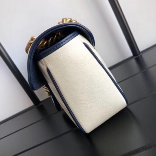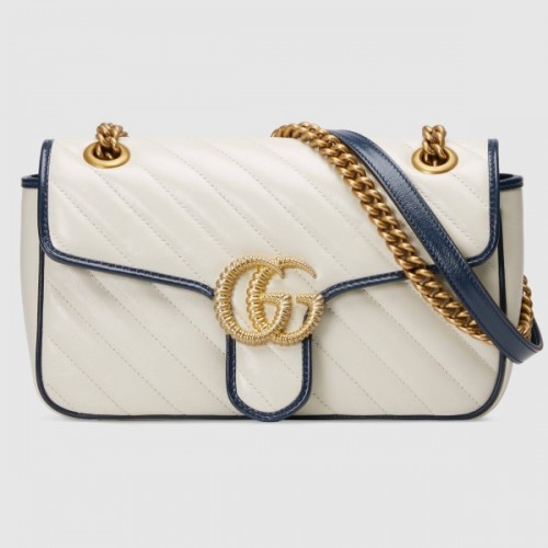 The GG Marmont bag is introduced in white for Cruise 2020, made from diagonal matelassé quilted leather and completed with a twisted torchon Double G embellishment. The small chain shoulder bag's distinct softly structured shape is outlined in contrast blue piping, highlighting its flap closure. The sliding chain strap smoothly transforms from a single shoulder length to a doubled top handle length for multiple ways to wear the bag.